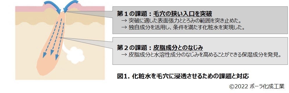 ポーラ・オルビスグループの研究・開発・生産を担うポーラ化成工業株式会社(本社:神奈川県横浜市、社長:釘丸和也)は、化粧水を毛穴内部に効率的に浸透させるための研究で以下の2点を解明しました。