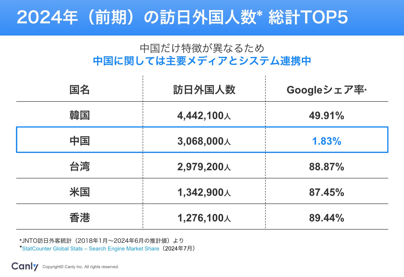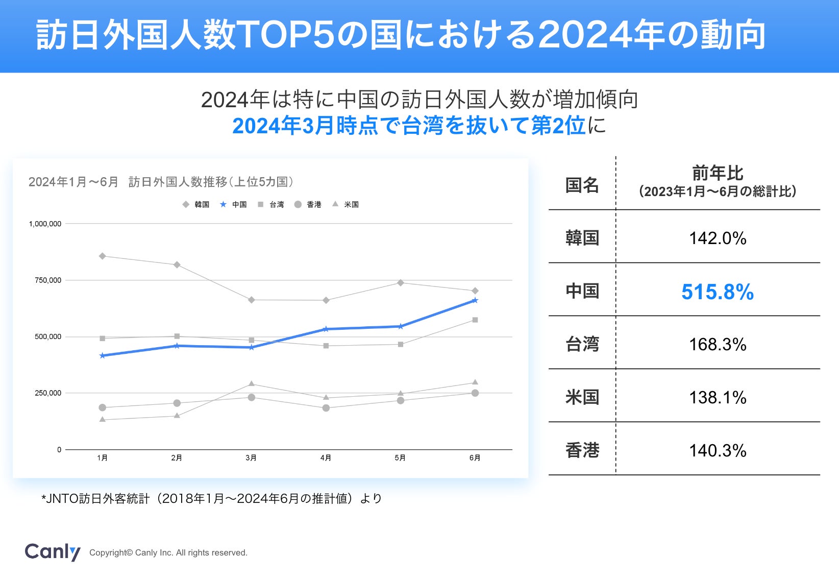 昨今、2025年の大阪万博の影響も含めアジア、中華圏からのインバウンド需要は日々増加傾向にあります。JNTOが出している訪日外国人数調査によると、2024年度の1月〜6月期において、中国からの訪日外国人数は前年同月比500%超えで推移しており2024年3月時点で台湾を抜いて2位に。今後も上昇していくと韓国を抜いて1位になる可能性もございます。