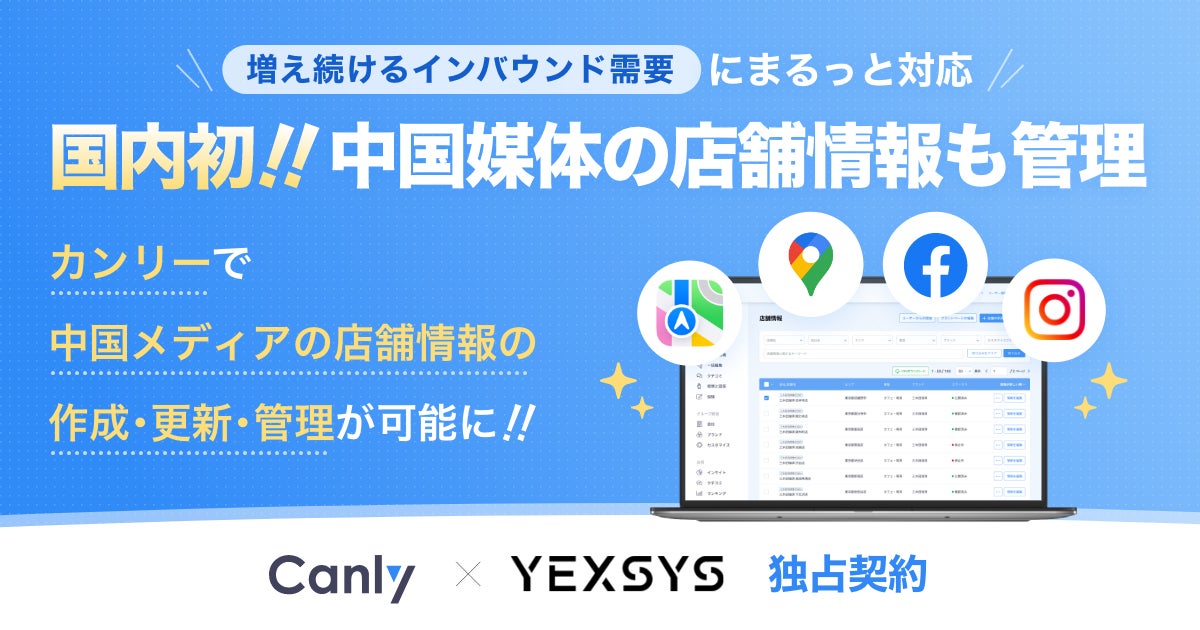 【国内初!中国主要媒体に店舗情報を掲載可能に】店舗集客媒体の一元管理SaaS「カンリー」が「YexSys」と独占契約*し、インバウンド対策を強化!!