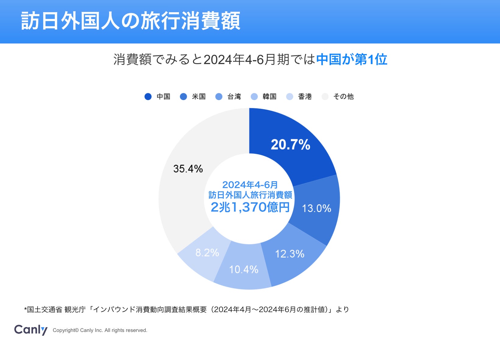 また、2024年4月-6月期における訪日外国人の旅行消費額で見ると中国が全体の2割を占める形でトップです。