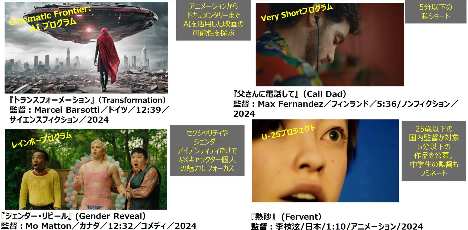 AIを使用して制作された作品の特集、レインボープログラム、恒例となった5分以下で楽しめるVery Shortプ ログラム、25歳以下の新進気鋭の日本人監督作品を選出するU-25プロジェクトなどをを先行配信(各プログラム5月27日(火)まで)。 その後、5月28日(水)~はオフィシャルコンペ&各プログラムの配信がスタートします。