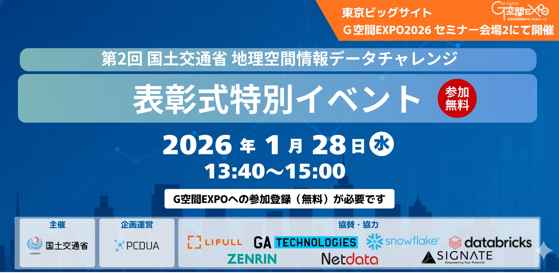 AI活用の戦略策定から実行、人材育成までを一気通貫で支援する株式会社SIGNATE(本社:東京都中央区、代表取締役社長:齊藤 秀、以下「SIGNATE」)は、2026年1月28日(水)に開催される「第2回 国土交通省 地理空間情報データチャレンジ」の表彰式特別イベントに、代表の齊藤が登壇することをお知らせいたします。