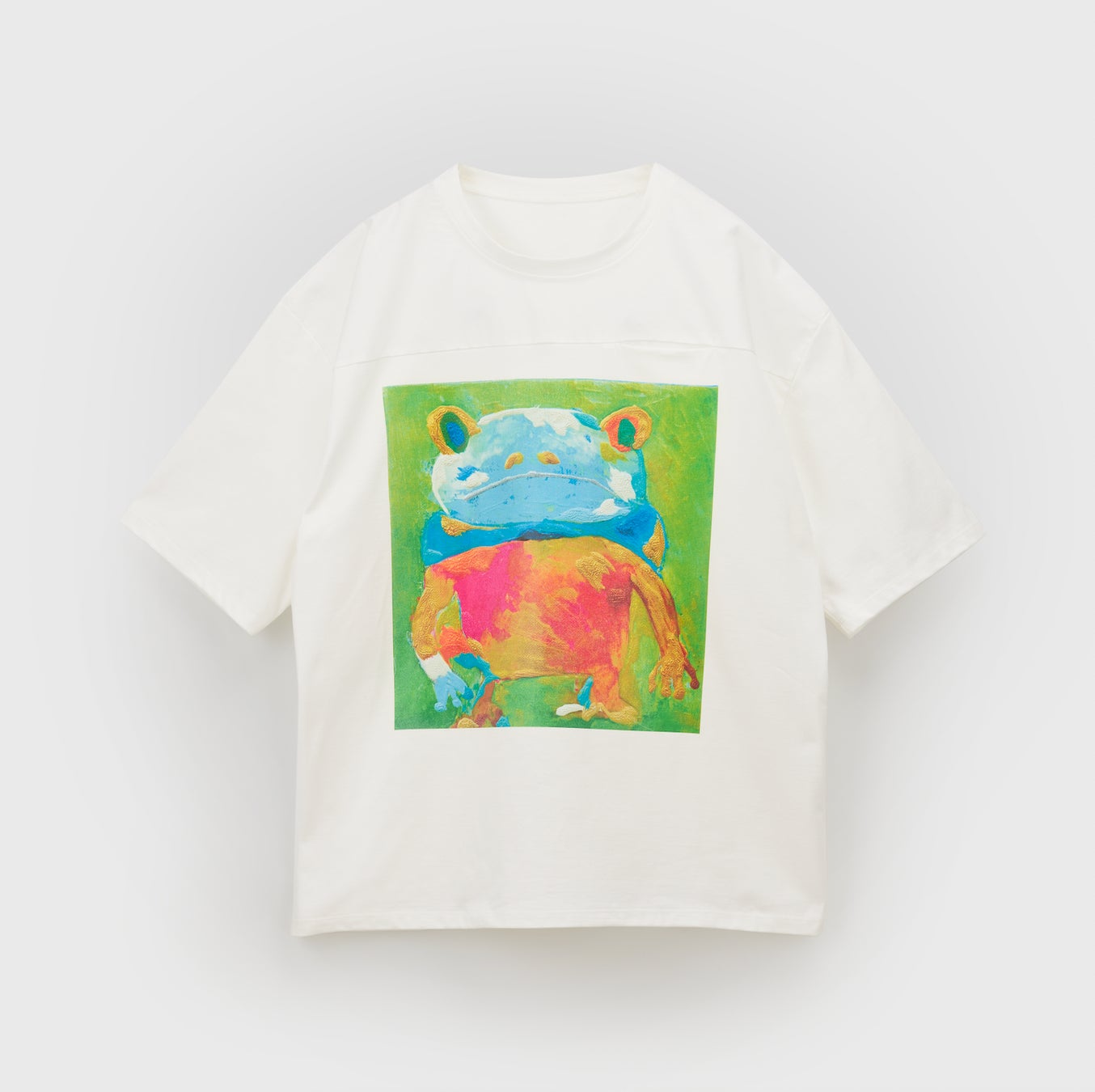 衣笠泰介が描く「カエル」は根強いファンが多く、これまでも複数作品が描かれています。その中でも、まっすぐな眼差しでこちらを見つめるカエルを描いた「旅に出ます」は、その可愛らしさと何処となく真の通った強さを感じられるカエルの表情が魅力です。その勇ましい表情は、人生の一大決心をして、旅に出るカエルの心境を描きたかったのかもしれません。衣笠の特徴でもある、厚く塗られた絵の具の質感までが表現されたアートTシャツは、着る人にとっても特別な一着となります。
