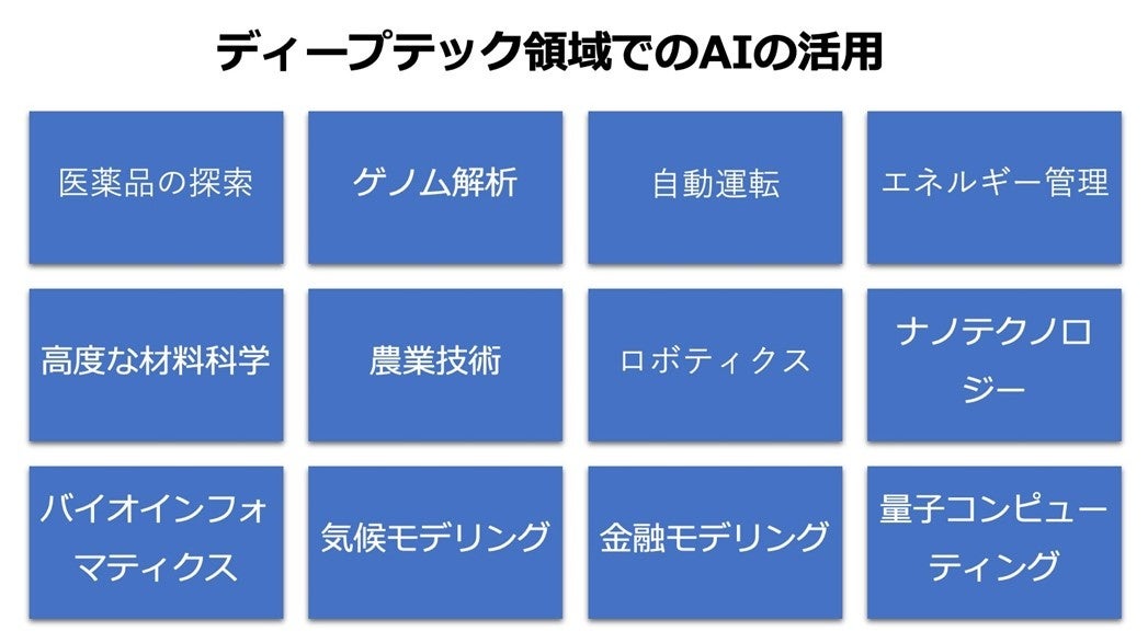 これらの活用例は、ディープテック領域におけるAIの可能性を示す一部に過ぎませんが、AIが多岐にわたる分野で急速に進展していることを示しています。