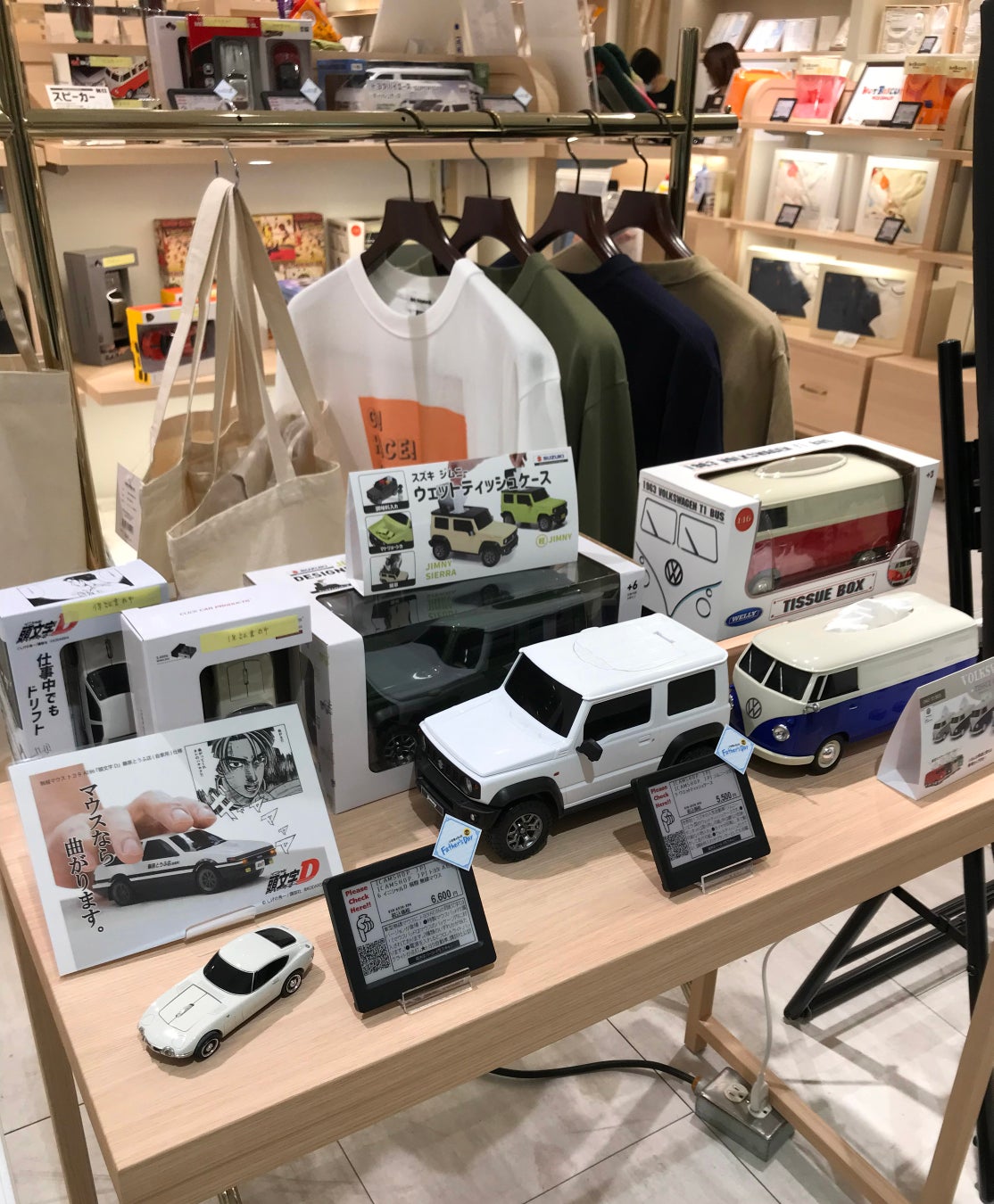 店頭ではウェットティッシュケース以外にも、ジムニーのTシャツ、トートバッグなどもあわせて展開しています。父の日のギフトとしてもお求めいただくことの多いグッズです。