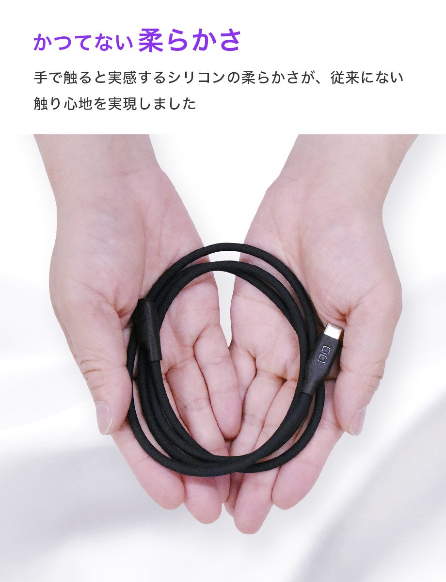 ケーブル被覆に柔軟性のあるシリコン素材を採用。しなやかで絡みづらいので使い心地・収納性にも優れます。心地よい肌触りで癖がつきにくいので、各デバイスの充電時ケーブルの取り回しに便利です。