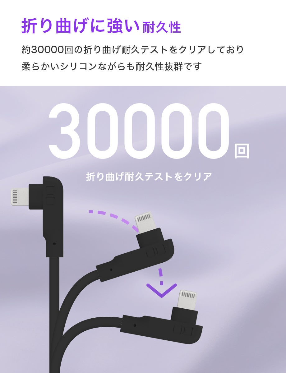 しなやかなシリコン素材&急速充電ケーブル『CIO-CLL30000』シリーズは肌触りに優れた柔軟なシリコン素材ながらも、30000回の折り曲げテストをパスするなど高耐久かつ急速充電に対応し、新たにコネクタをL字形状にした充電ケーブルです。Lightning搭載ケーブルはApple MFi認証を取得しているため、iPhoneやiPad等に最適に動作し、OSのアップデート後も安心してご使用いただけます。