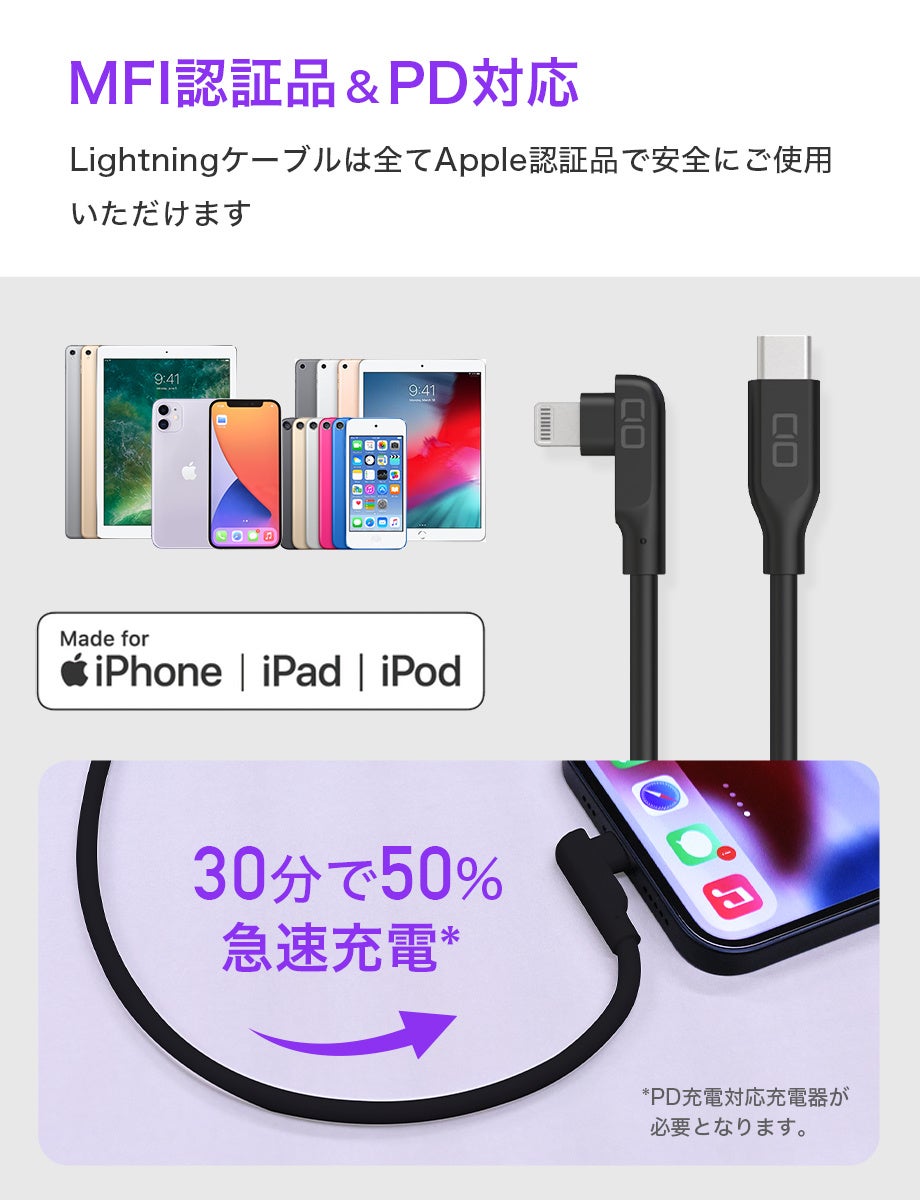 iPhone8以降、iPad/iPadPro(一部機種)の急速充電に対応。20W充電にも対応しているためPD対応アダプタとの組み合わせで30分で約50%の充電が可能です。