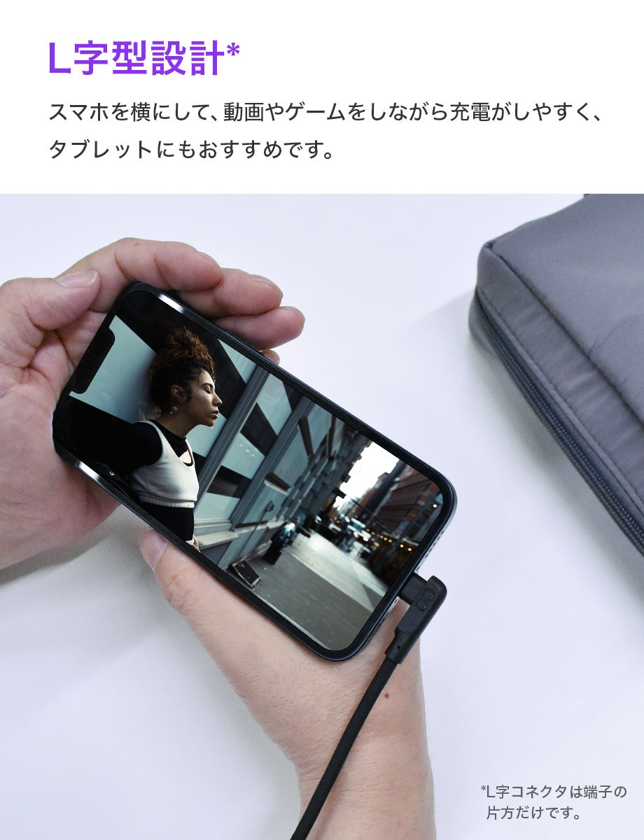 L字設計により横画面にてコネクタが邪魔にならないため、動画を視聴しながらやゲームをプレイしながらの充電がしやすくなっています。コネクタ部分が飛び出ないので、ケーブルの取り回しも大変便利です。