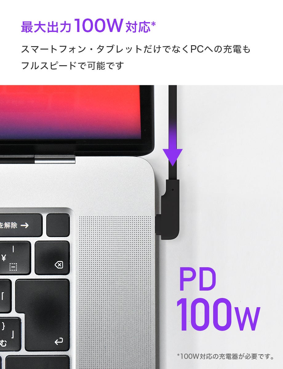 USB-C to USB-Cケーブルは最大100WのPD充電に対応。スマートフォンのみならずPD対応パソコンやタブレットなどでもご使用いただけます。
