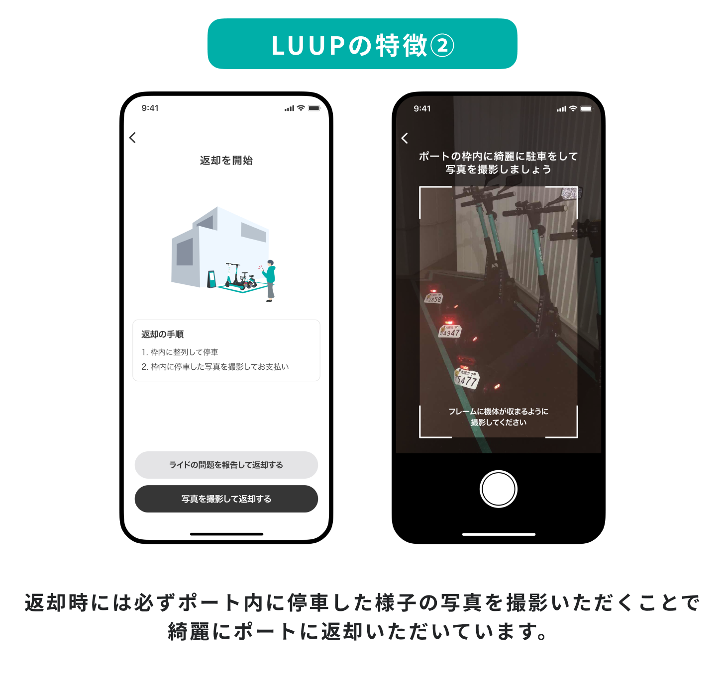 また、ライドを開始する時にアプリ上で車両を返却する目的地ポートを事前に予約することを必須としているため、特定のポートに返却が集中して車両があふれることがありません。さらに、返却時には必ずポート内に停車した様子の写真を撮影し、送信いただく仕様にしていることから、綺麗にポートに返却いただいています。景観を守り、街の皆さまにご迷惑をおかけしないようなサービス設計になっています。