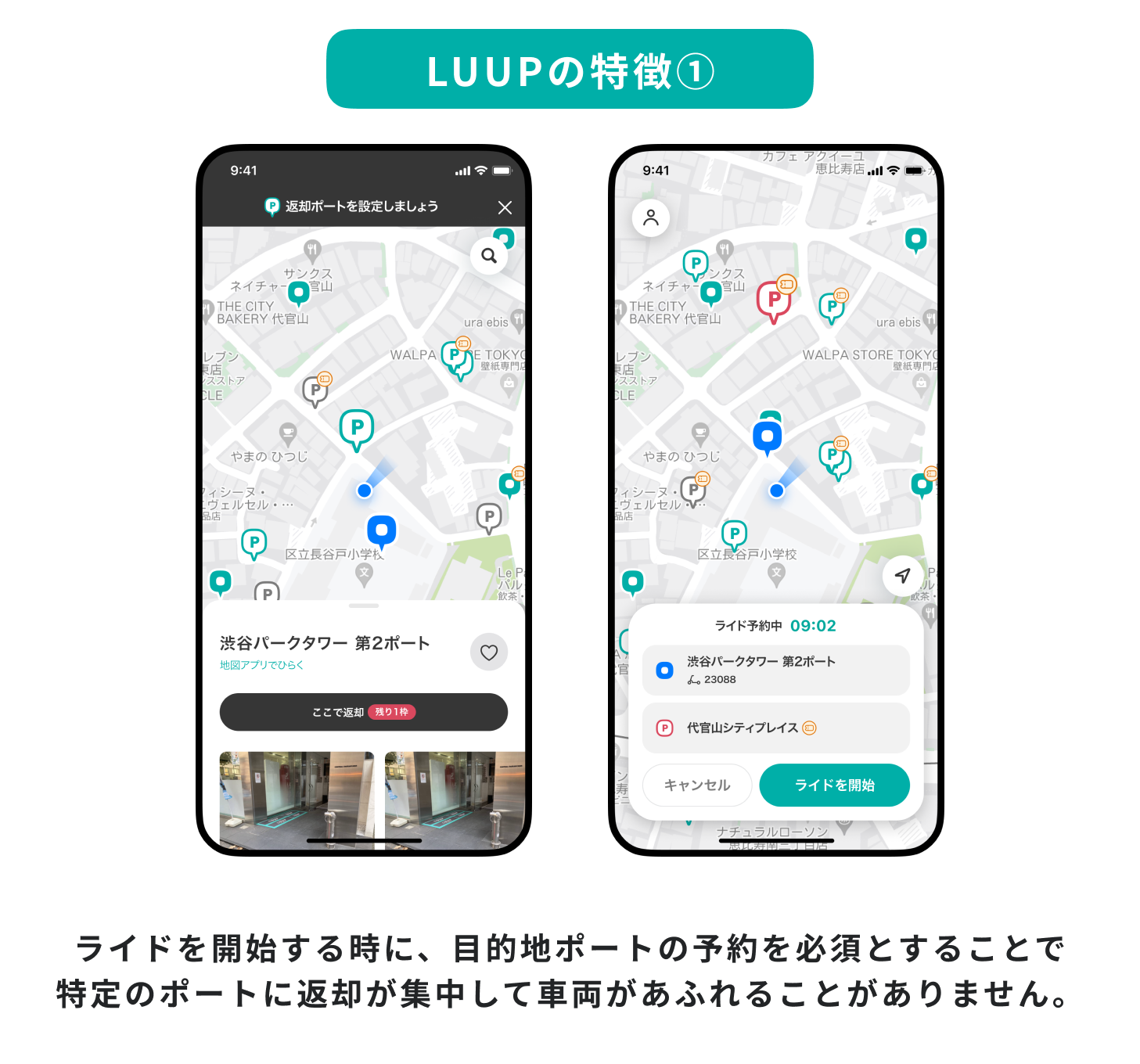 スマートフォンアプリ「LUUP」を用いて、電動キックボードや電動アシスト自転車に乗車し、街じゅうにあるポートからポートへの移動ができます。