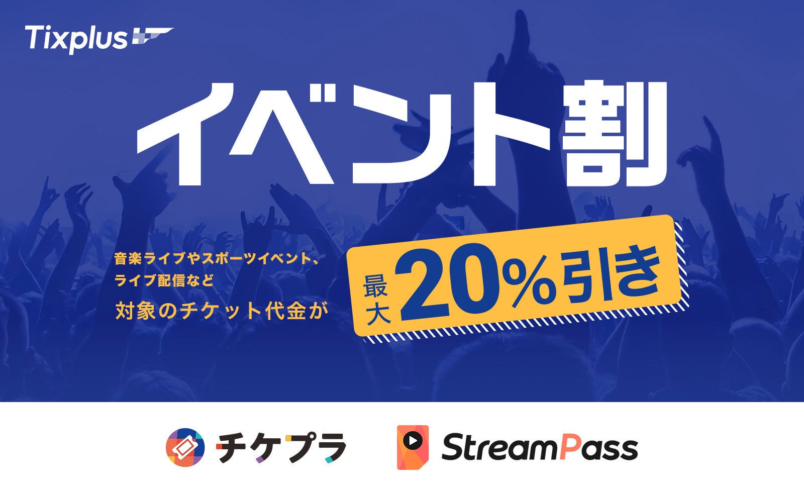イベント割事業では観客動員を伴って開催されるイベントだけでなく、配信イベントも対象として割引が適用されます。Tixplusでは対象となるチケットを通常価格より最大20%の割引を適用した価格で販売いたします。