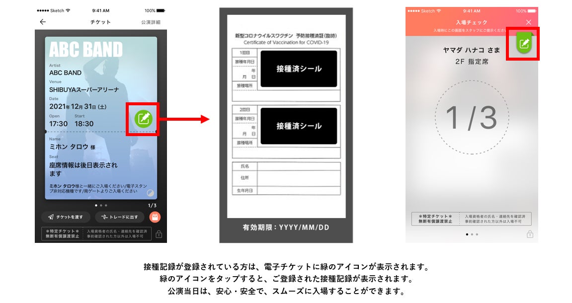 この課題に対して「チケプラ電子チケット」ではワクチン接種証明を事前に登録いただくことで、電子チケット上にワクチン接種済であることをわかりやすく表示。運営スタッフは一目でチケットとワクチン接種記録を確認でき、お客様はスマホのチケット画面一つの提示でご入場。安心・安全で、スムーズな入場を実現することが可能です。