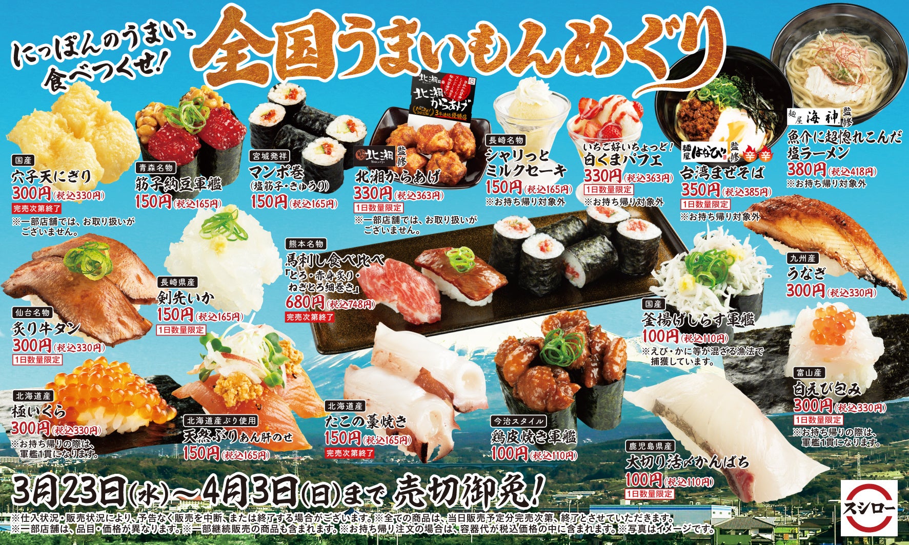 北海道のいくらから九州の馬刺しまで!全国のうまいもんが堪能できる、スシロー『全国うまいもんめぐり』開催!<3月23日(水)より全国のスシローにて期間限定で開催>