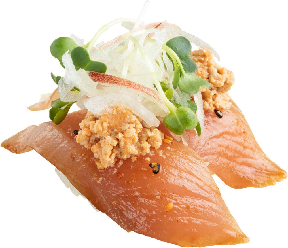 青森でよく食べられる組み合わせの「筋子と納豆」を軍艦に仕立てました。筋子の旨みと塩味が、すしに合うように小粒の大豆を使用しているスシローこだわりの納豆と意外なほど良くあい、新たなマリアージュが爆誕!こんな食べ方あったのか!と膝を打つ、くせになる味わいをお試しあれ!