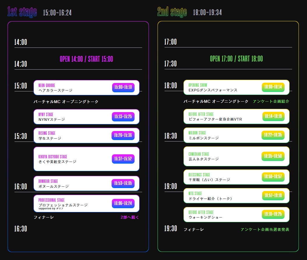 「関西の女性をもっと美しく」をコンセプトに、美容とサロンワークの質の向上を目指し、最新トレンドや技術を“観て・触って・体験できる”関西最大級のビューティーエキスポです。今回初めて二部制で開催される本イベントでは、ヘアショーを中心とした「プロフェッショナルステージ」(第1部)と、美容とエンターテインメントを融合させた「エンターテインメントステージ」(第2部)が展開されます。NYNYの美容師は、第1部のヘアカラーステージ「NEON GROOVE」と、NYNYの個別ステージ「SINGULARITY」に出演予定です。