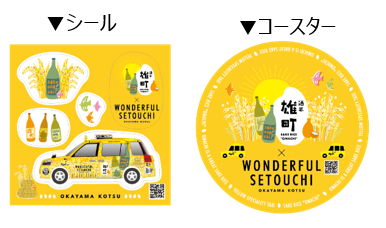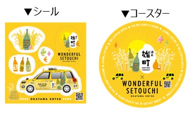 「酒米・雄町タクシー」にご乗車いただいたお客様には、ご乗車記念としてオリジナルデザインのシールとコルクコースターを無料配布いたします。