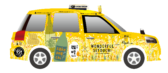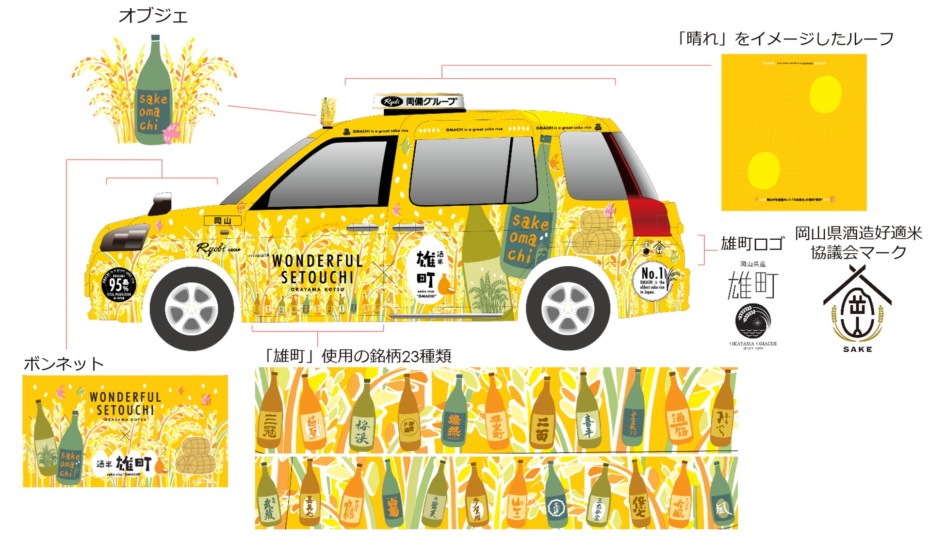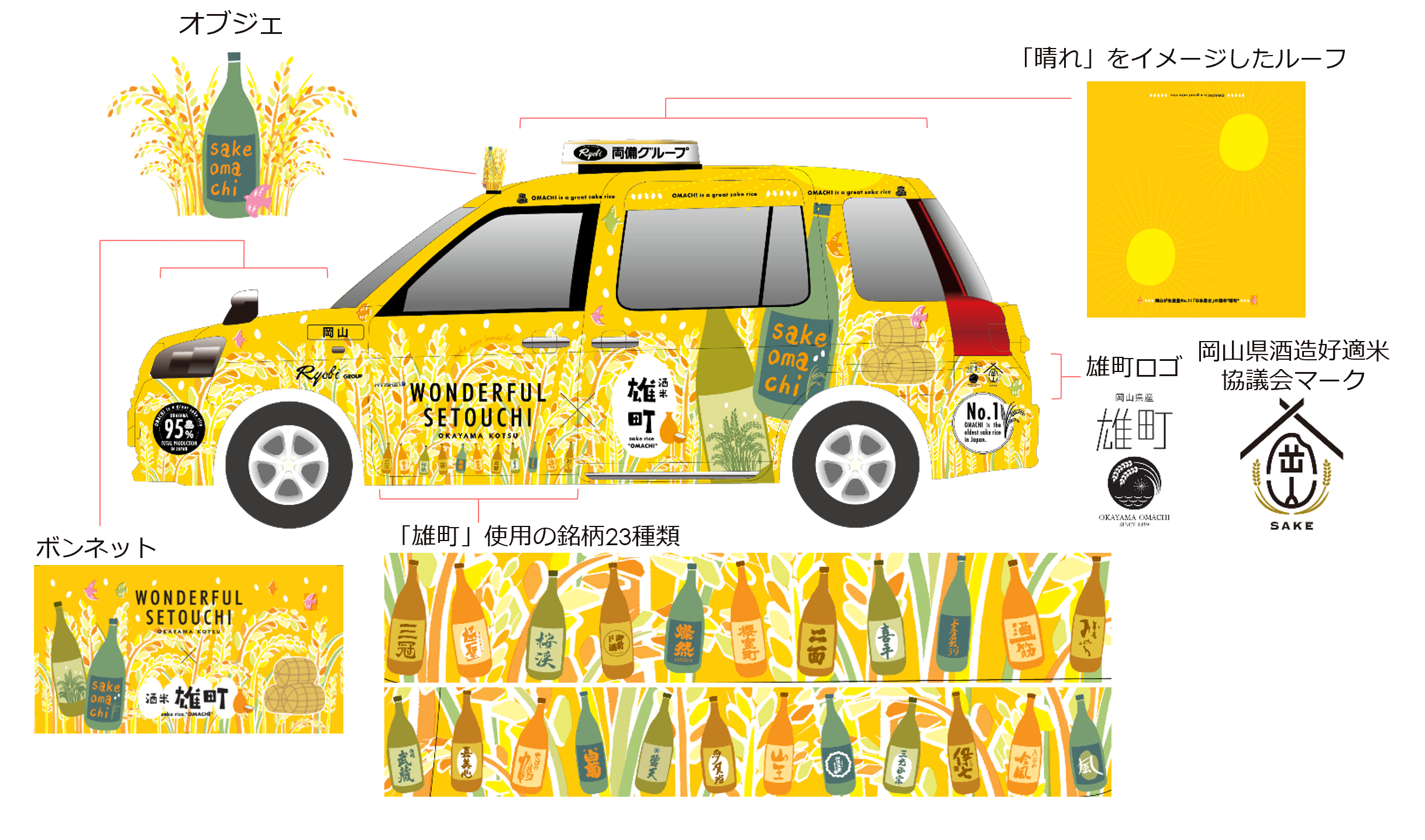 このたび、この「雄町」の黄金色に輝く稲穂と日本酒を全面にあしらったタクシー車両が誕生しました。インパクトのあるタクシーが岡山の街を走ることで「雄町」への注目度が高まると幸いです。
