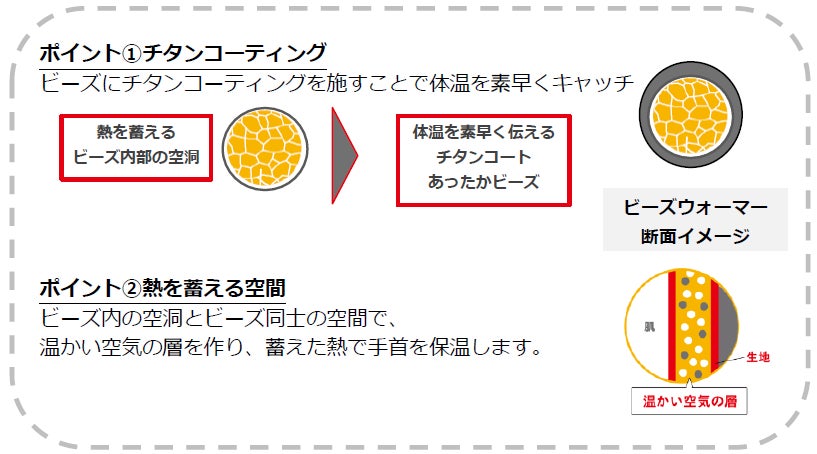 ・体温を素早く伝えるビーズが、手首をやさしく包みこんで保温