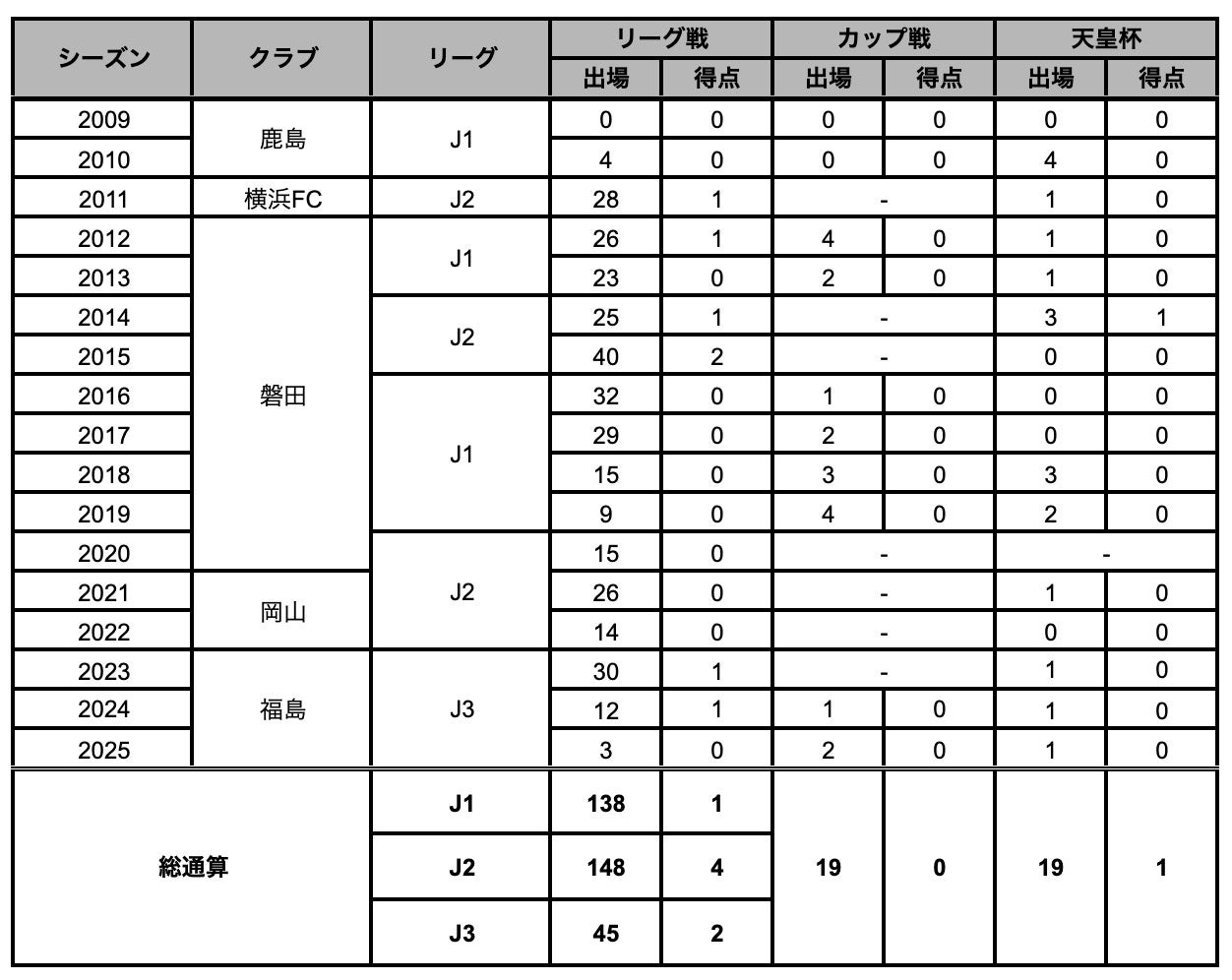 【サッカー歴】田無SC→横河FC Jrユース→FC東京U-18→流通経済大→鹿島アントラーズ→横浜FC→ジュビロ磐田→ファジアーノ岡山→福島ユナイテッドFC