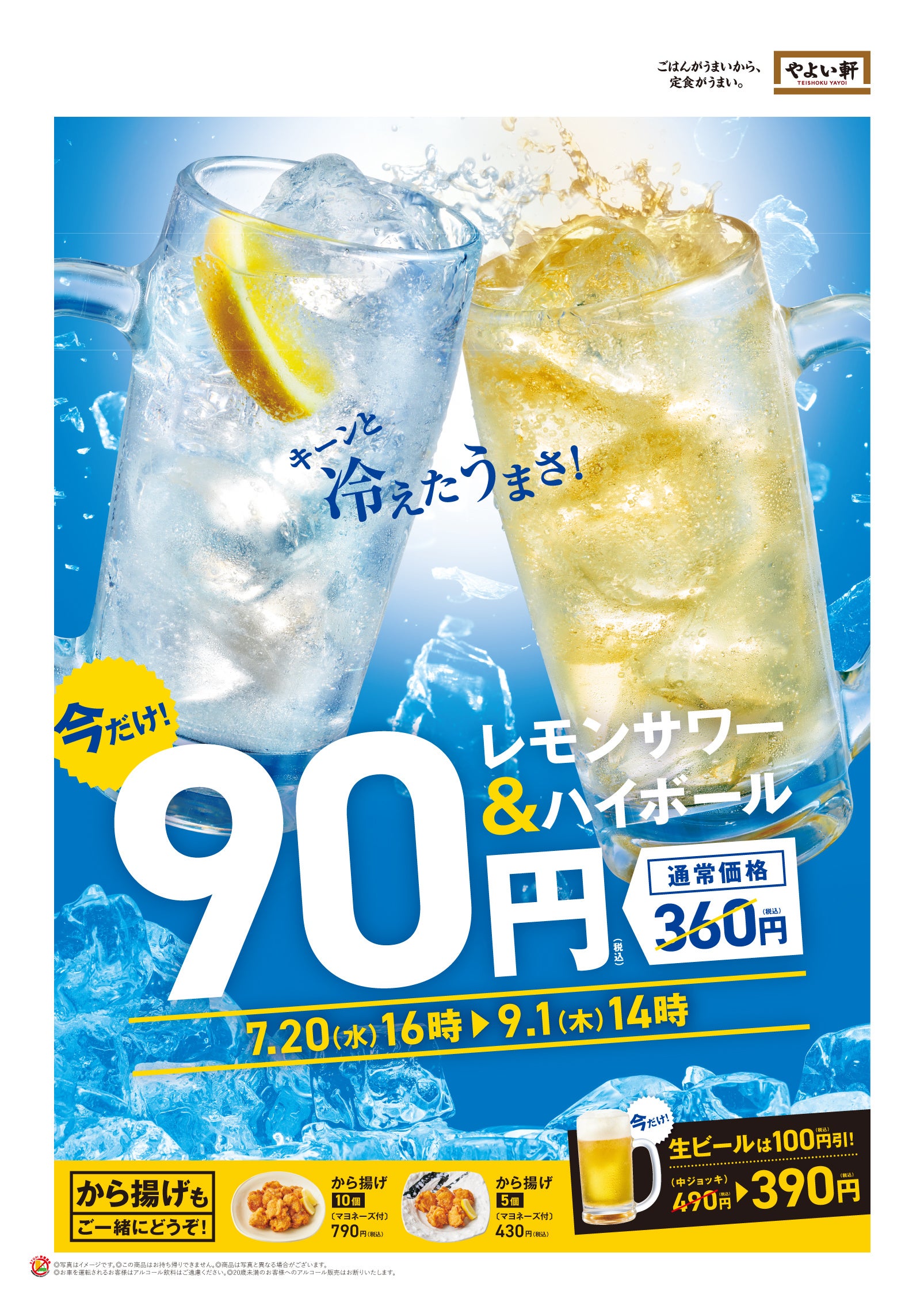 株式会社プレナスは、定食レストラン「やよい軒」を、2022年6月末現在366店舗展開しております。このたび「やよい軒」では、大人にも子供にも喜んでいただける夏休み限定のキャンペーンを実施いたします。7月20日(水)16時より9月1日(木)14時までの期間限定で、暑い日に嬉しい『レモンサワー』、『ハイボール』を90円、『生ビール』を通常価格より100円引きの390円で販売いたします。また、キャンペーンに合わせてアルコールと相性の良い『から揚げ(5個)』430円と『から揚げ(10個)』790円を、新発売いたします。