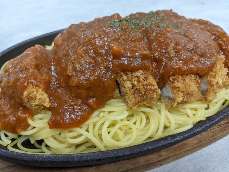 熱々の鉄板の上に、パスタ・とんかつ・ミートソースを加えた、ボリューム満点の一皿。