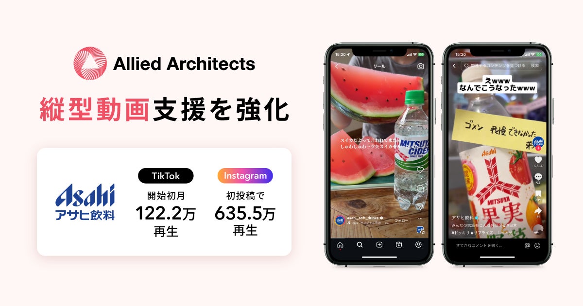 2024年5月より支援を開始したアサヒ飲料株式会社(以下、アサヒ飲料)においては、TikTokの運用支援開始初月のオーガニック投稿において122.2万再生を達成、さらにInstagramではアライドアーキテクツ制作した動画の初投稿が635.5万再生を突破するなど、顧客企業のSNS活用支援において顕著な成果を挙げましたので、お知らせいたします。
