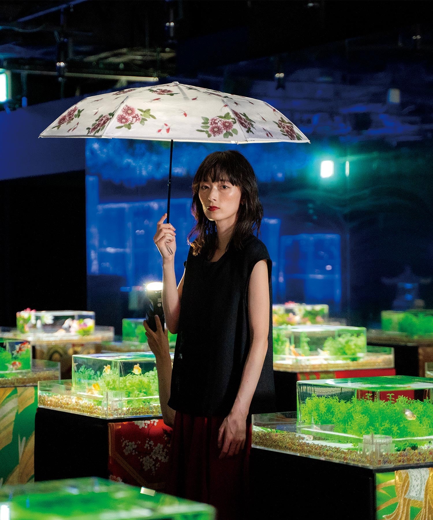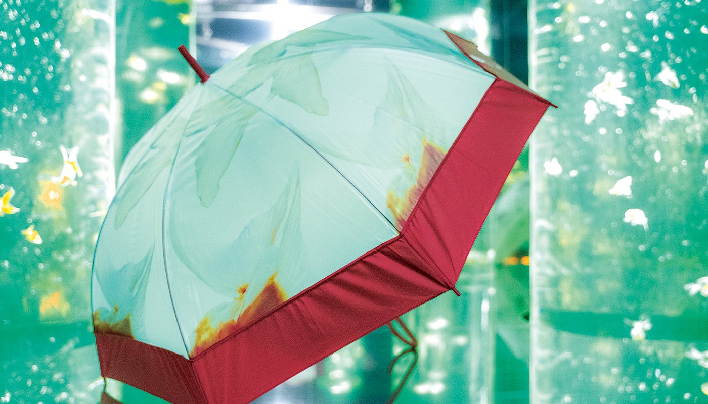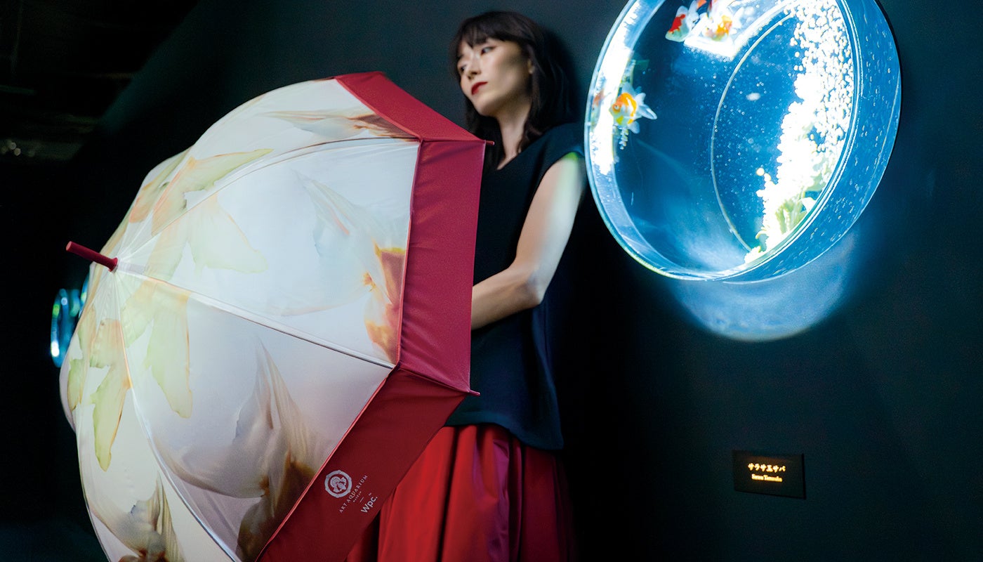 ライティングの演出とともに、金魚を様々な角度から見られる作品『金魚蒐集』モチーフの傘。