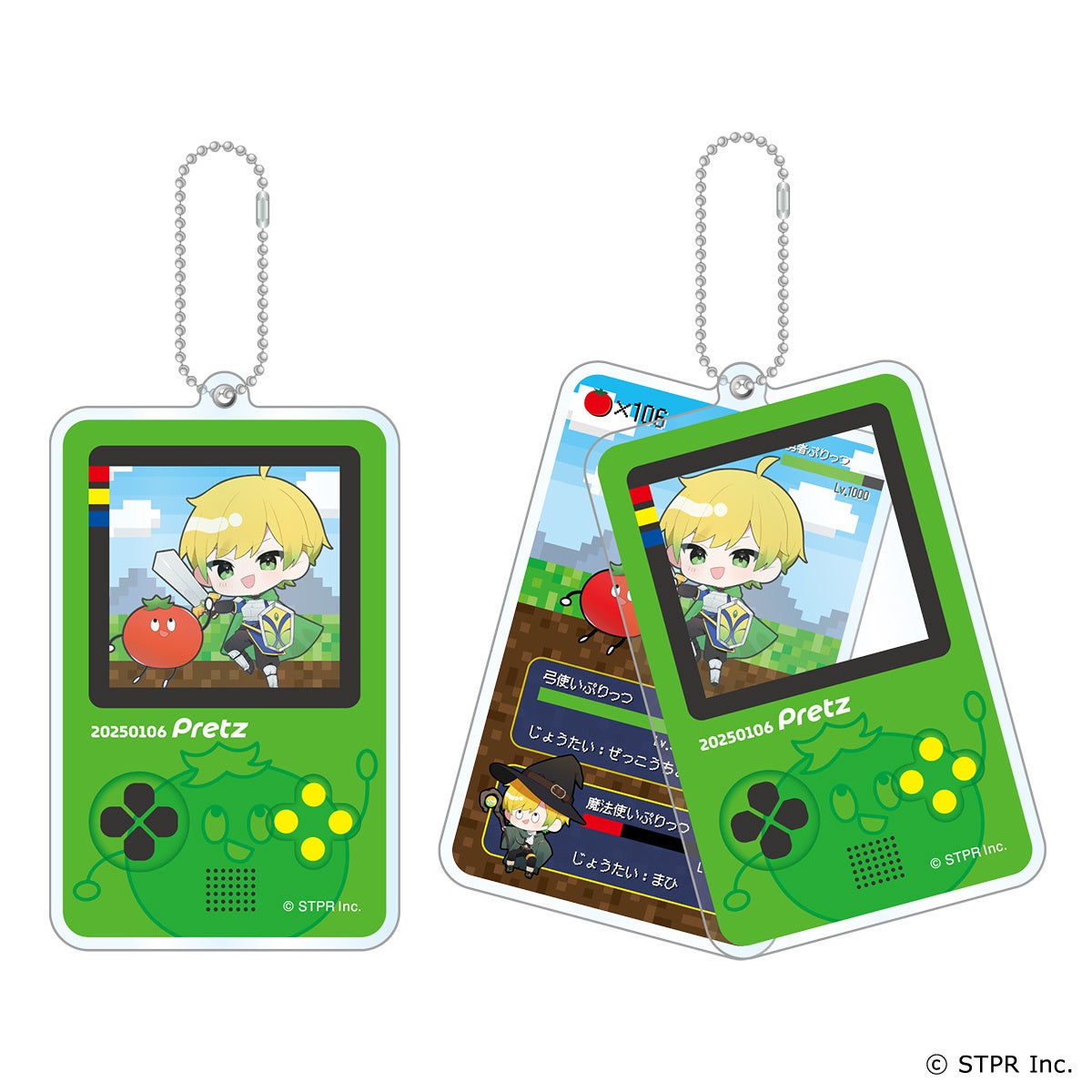 ゲーム機をモチーフにした1枚目のアクリルパーツを2枚目のパーツに重ねることで、まるで”ぷりっつ”がゲームの主人公になっている雰囲気を楽しめ、2枚目のパーツのみでもレトロゲーム風のデザインを楽しむことができます。