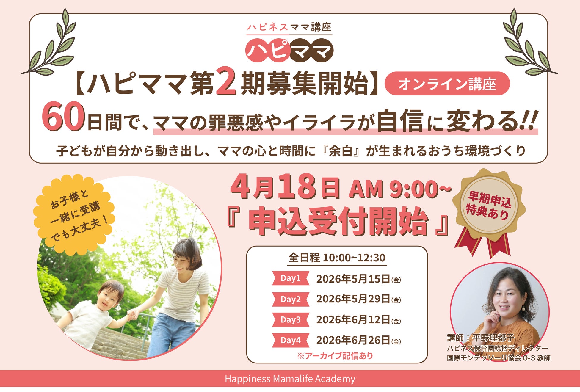 三和ホールディングス株式会社(本社:福岡市博多区、代表取締役社⻑:石井清悟)のグループ企業であるアイリンクス株式会社(本社:福岡市博多区、代表取締役社長:石井 清悟)は、国際モンテッソーリ教師であり、ハピネス保育園グループ統括ディレクターを務める平野理都子が開発したママを対象とした60日間のオンライン実践プログラム、ハピネスママ講座「ハピママ」第2期の募集を2026年4月18日より開始いたします。これまでに計1000人以上のママの悩みと向き合ってきた実績をもとに、家庭環境の最適化とママ自身の「観察眼」を養うワークを通じて、親子ともに自立し、笑顔で歩める未来を創出します。