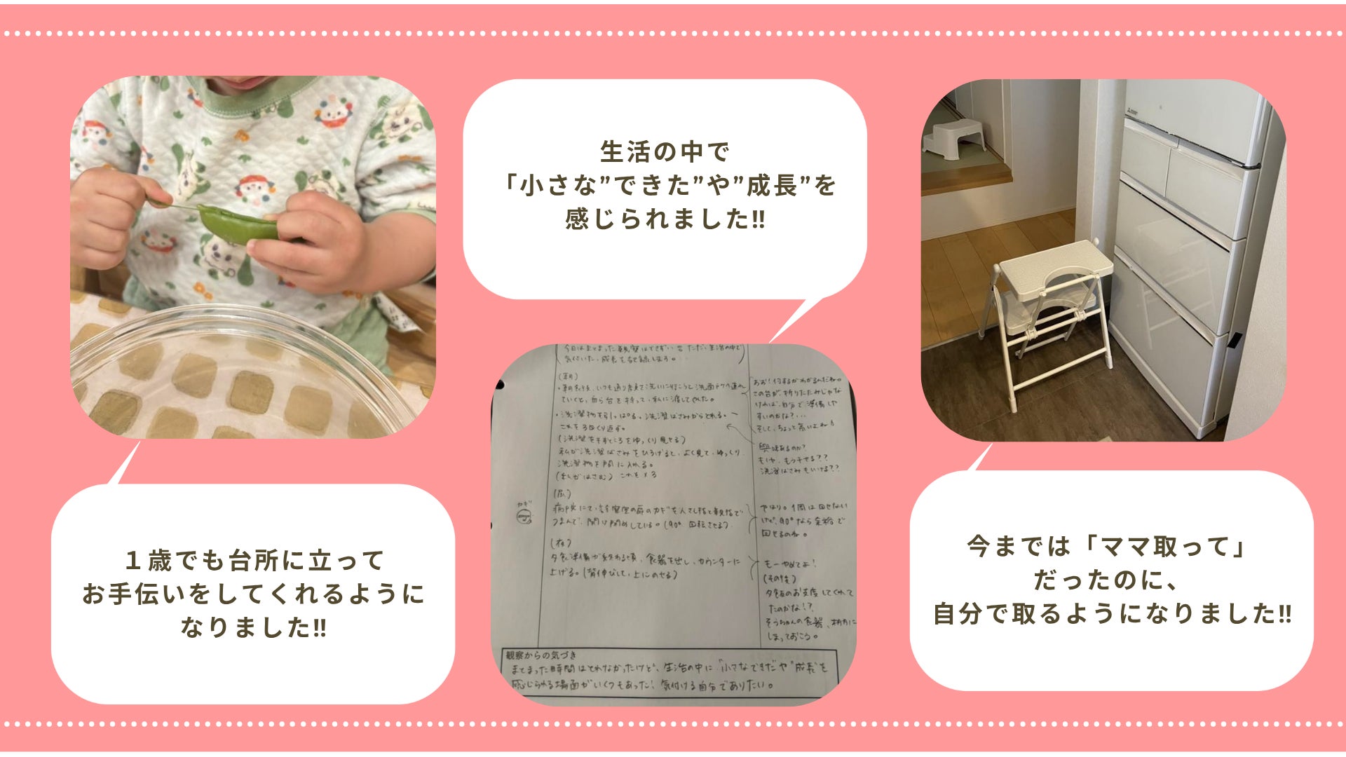 ・1歳児から自ら動く「おうち環境」:道具の位置やサイズ、動線を整えるワークを通じ、子どもが自分でお皿を出し、お片づけまで行う自立心が育ちました 。