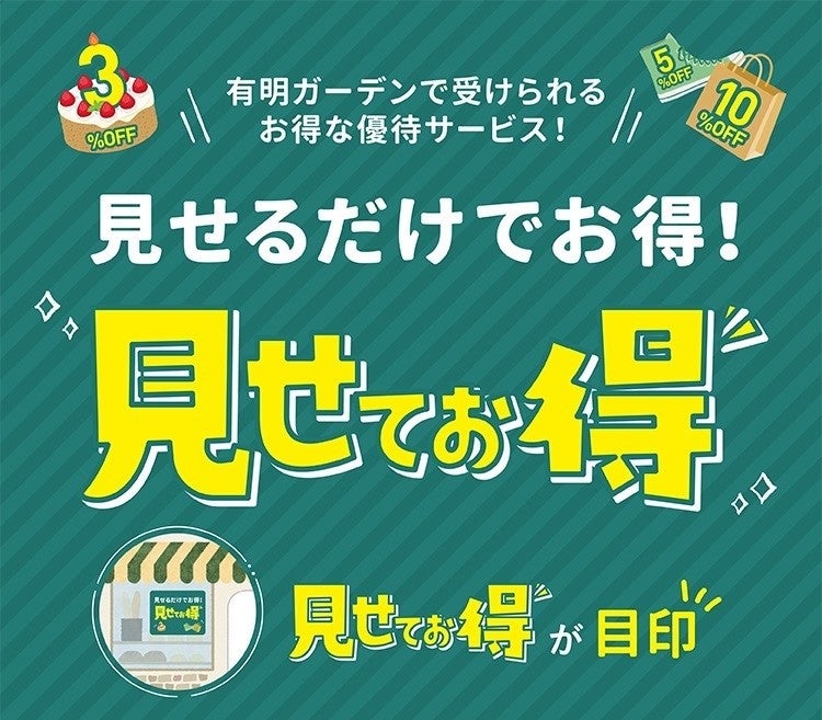 『見せてお得』は、複合商業施設「有明ガーデン」内の各施設をご利用の方が、モール店舗の割引やサービスが受けられる優待サービスです。チケットやレシートを見せるだけですぐに使えるので、お近くにお住まいの方から、イベントや旅行などで有明を訪れる方まで、気軽にご利用いただくことができます。