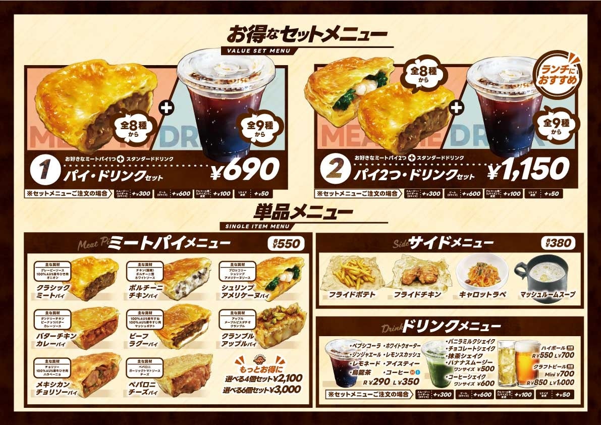 内容:ミートパイ(単品)・セットメニュー・ドリンクメニューが50円引き ※サイドメニューは対象外、他割引と併用不可。