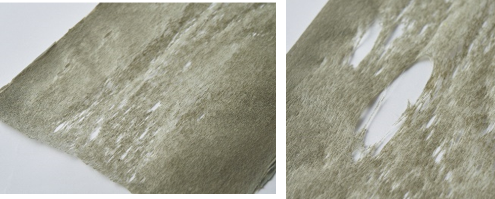 つめかえパックリサイクルの実現に向けては、つめかえパックを構成する素材のうち、約80%を占めるポリエチレンの性質を活かし、その他不純物となるPET、ナイロン、アルミ箔、インク等の影響をおさえる必要がありました。当初、使用済みつめかえパックを再度フィルム化する工程のなかで、つめかえパックに含まれるアルミ箔やインクなどが粉砕しきれず異物として残ってしまい、それによってフィルムに孔(あな)があいてしまうという課題がありました(図)。そこで、アルミ箔が含まれるつめかえパックを選別工程であらかじめ除き、リサイクルすることで、フィルム化工程で孔があく原因となる異物の低減につなげました。さらに、ポリエチレンとPET、ナイロンなど、互いに混ざりあわない素材を混ざりやすくするために、相溶化剤を添加し細かく分散させることや、インクや接着剤をフィルム化工程で悪影響をおよぼさない程度まで細かくすることにより、孔のない均質なフィルムとすることができました。しかし、製品化に向けて容器の基材面に印刷を施すと、ごくわずかな凹凸が顕在化する事がわかりました。この凹凸は、外観性や、容器の機能を担保するうえで課題があると考え、さらなる技術開発を行いました。