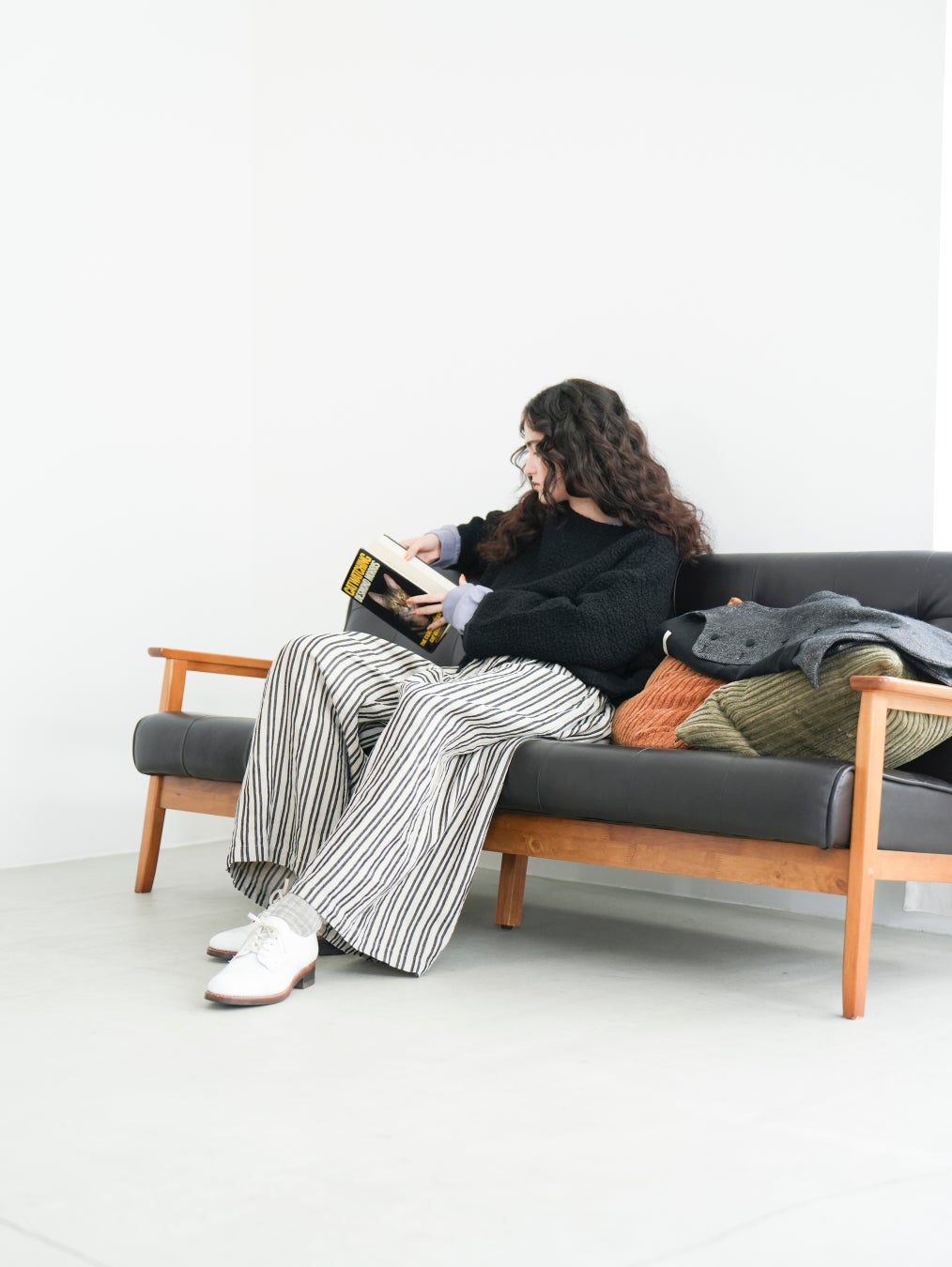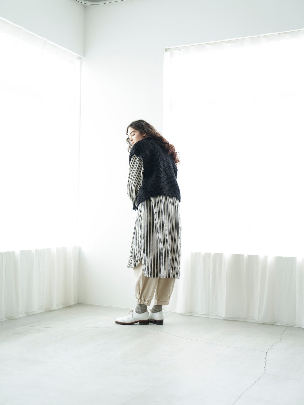 素材を活かしたシンプルなデザインの為、ニットカーディガン感覚でラフに着用していただくのがおすすめです。