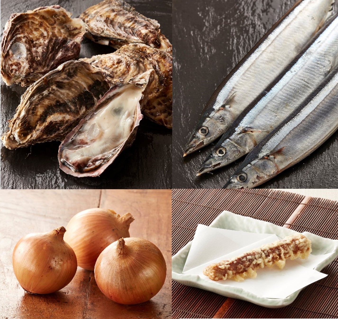 内容(5種): 播磨灘産の牡蠣、三陸産秋刀魚、淡路島玉ねぎのつまみ揚げ(三つ葉入り)、