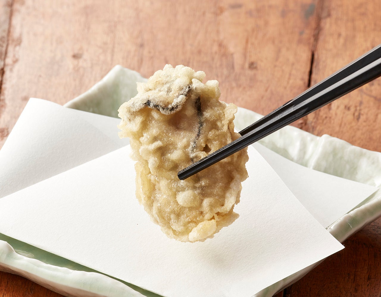 瀬戸内海東部の兵庫県播磨灘で養殖される牡蠣は、多くの自然に囲まれた播磨灘と、山から川を伝って届く豊富な栄養分に育まれ、1年でふっくら大粒に成長します。旨みがありながらもくせがなく食べやすいのが特徴です。蒸してから天ぷらにすることでふっくらぷりぷりの食べ応えとジューシー感を堪能いただけます。