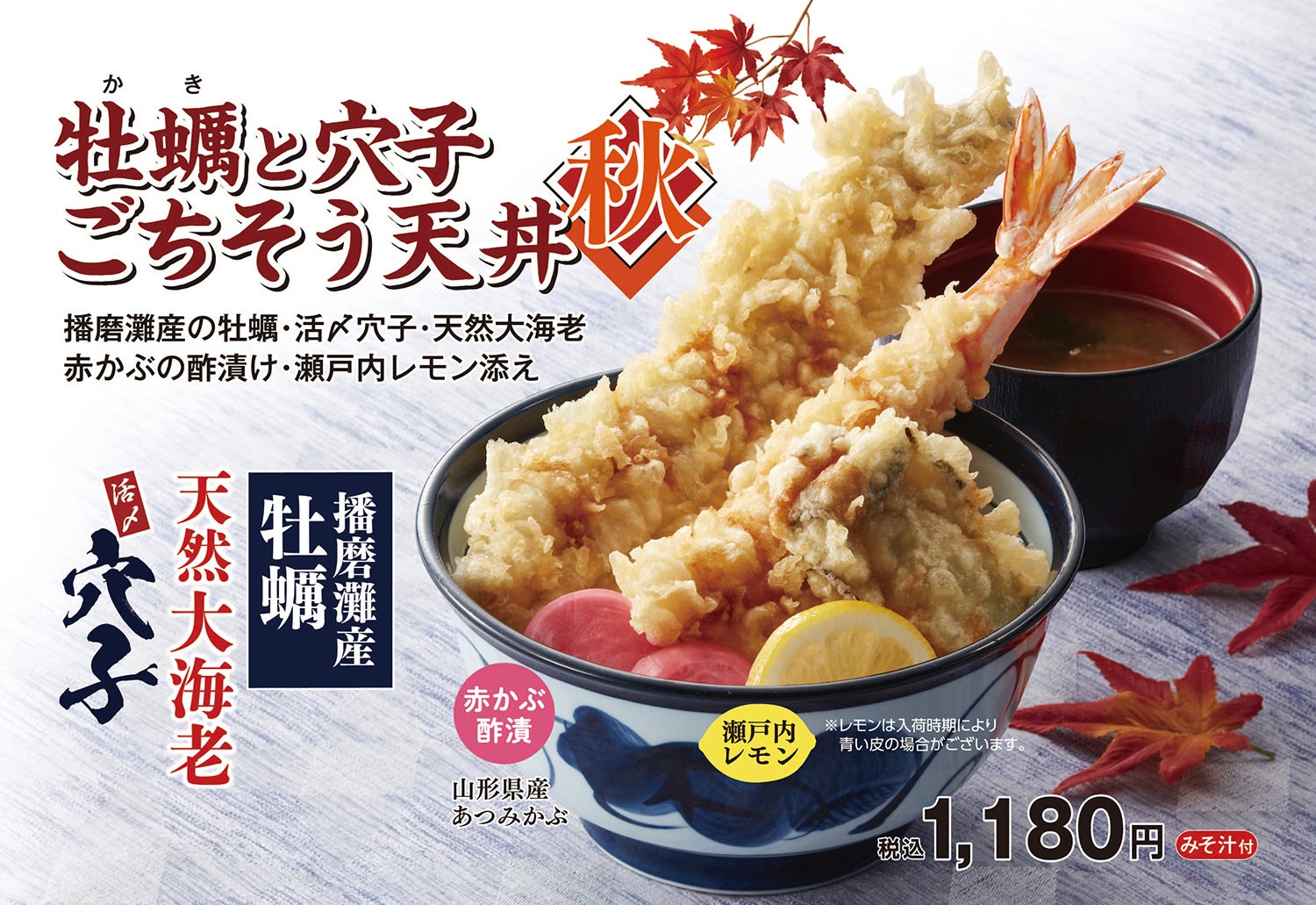 播磨灘産の牡蠣・三陸産秋刀魚・淡路島玉ねぎなど、日本の恵みの天ぷらに瀬戸内レモンを添えた『秋天丼』『ごちそう天丼』が9月21日(木)から全国の天丼てんやで販売開始