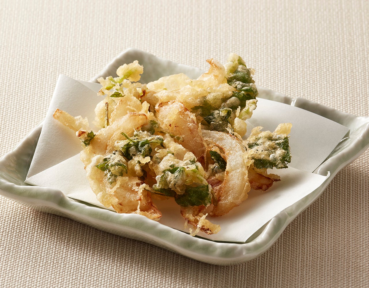 兵庫県の南にある淡路島の玉ねぎは、繰り返し品種改良が行われ高い糖度を持つ全国有数のブランド玉ねぎです。てんやでは爽やかな香りの三つ葉を合わせ玉ねぎの甘さと食感を楽しめるつまみ揚げでお楽しみいただけます。
