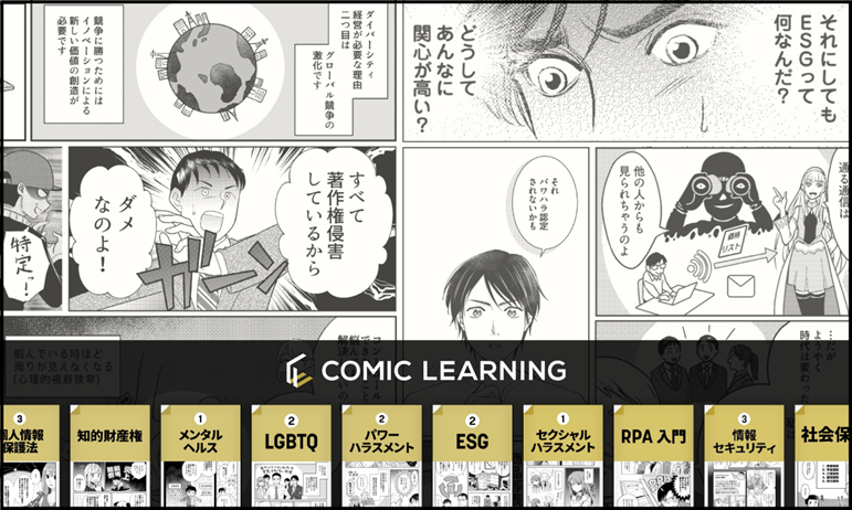 2021年8月に提供を開始した『コミックラーニング』は、インターネットを利用した学習方法であるe-Learningにコミック教材を活用することで、誰もが学びたくなる研修に変えていく研修ツールです。