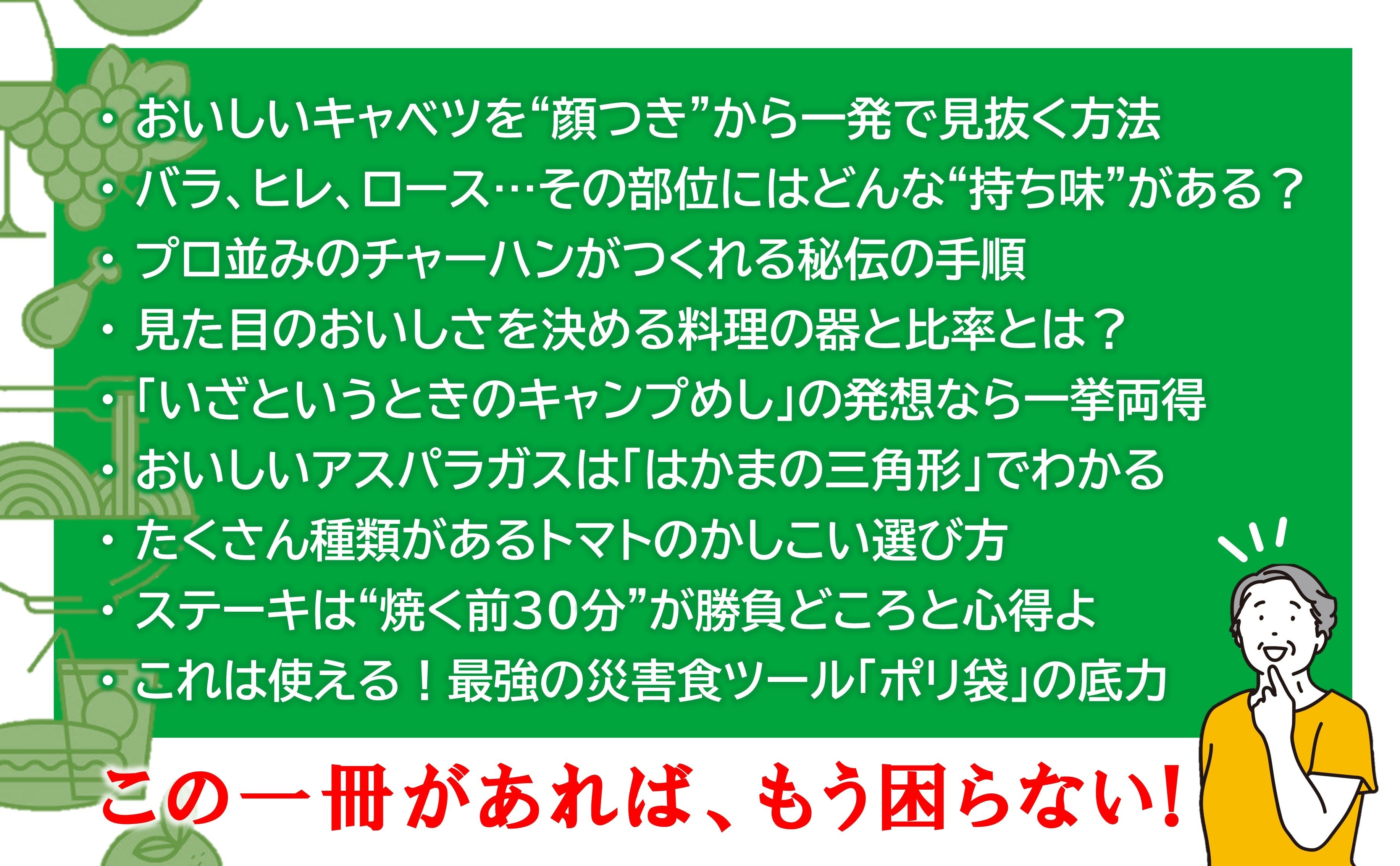 スーパーで鮮度抜群の食材をひと目で見抜くワザ、調理から片付までの流れを手際よく見せるコツ、いつか役立つ防災レシピ、胃も心も満たす食のうんちくなど、本書には、美味しい話題をまるごとパッケージしました。