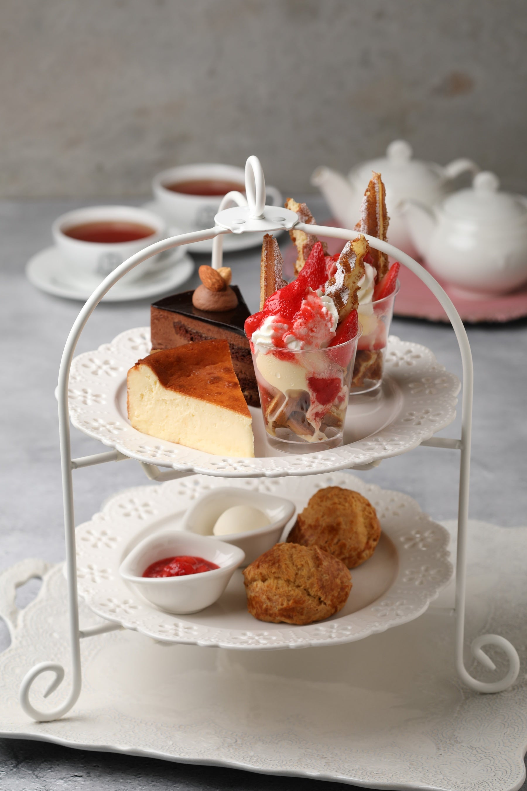 季節のケーキやミニパフェを紅茶で味わう贅沢な「アフタヌーンティーセット」です。上段には2種類のケーキに加え、紅ほっぺのいちごのミニパフェが並びます。下段のスコーンは、お好みで、クロテッドクリームやいちごジャムをつけてお召し上がりください。ドリンクはドリンクセットメニューの中からお選びいただけます。
