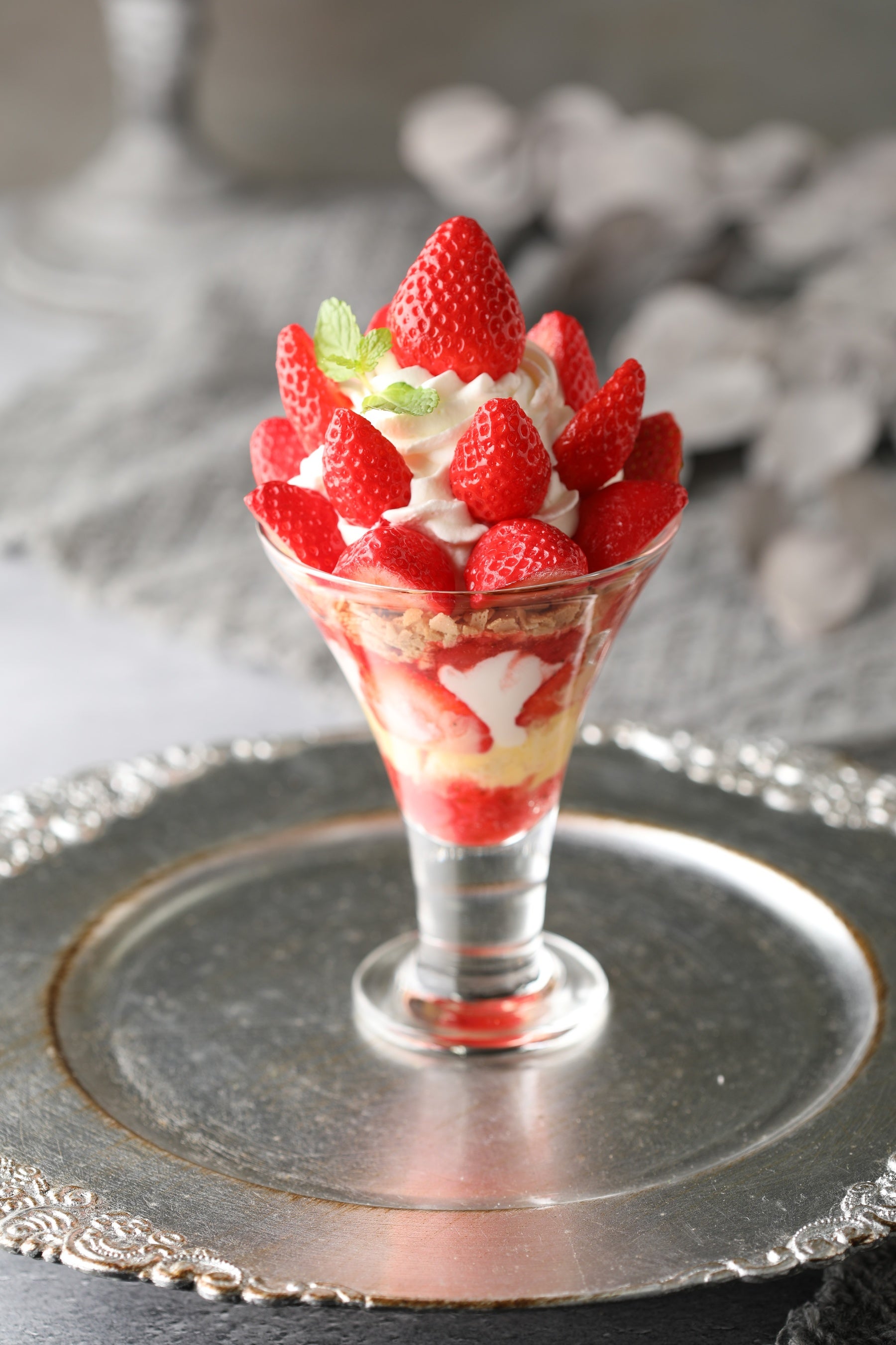 甘味と酸味のバランスが良くコクのある「紅ほっぺ」のいちごに、ホイップクリーム、バニラアイス、スポンジケーキ、サクサク食感のフィアンティーヌと果肉入りの自家製いちごソースを合わせました。いちごのおいしさを堪能できる贅沢な冬のスイーツパフェです