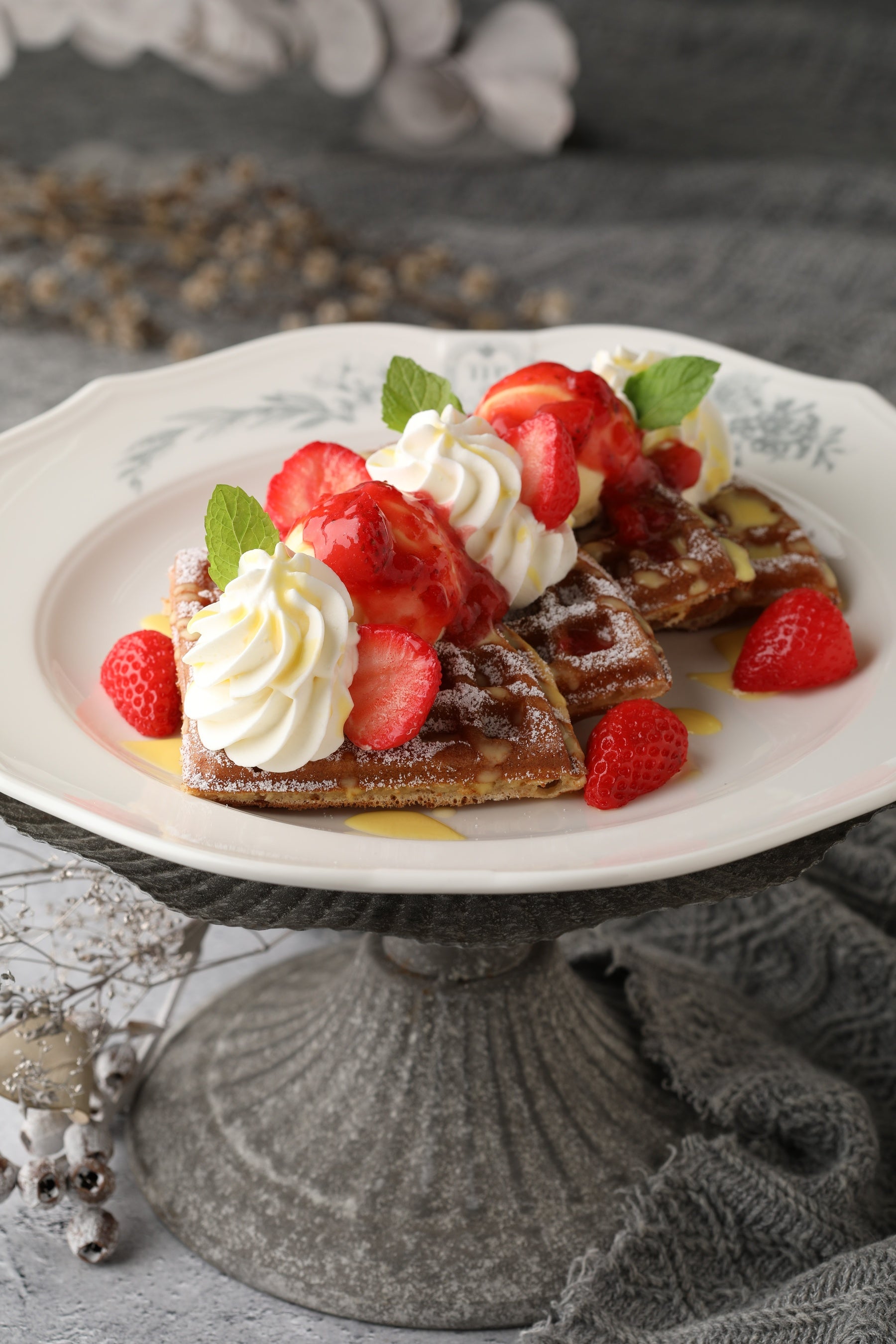 毎日お店で生地から作りあげるサックリとした食感のワッフルに、甘味と酸味のバランスが良くコクのある味わいの「紅ほっぺ」を組み合わせた、冬限定のワッフルです。バニラアイスに「紅ほっぺ」と純生クリームのホイップをトッピングし、果肉入りのいちごソース・アングレーズソースで仕上げました。焼きたてのワッフルにバニラアイスとホイップクリームがとろけ、甘酸っぱいいちごの果実のおいしさを存分に引き立てます。紅茶との相性も楽しんでいただきたい冬のスイーツワッフルです。