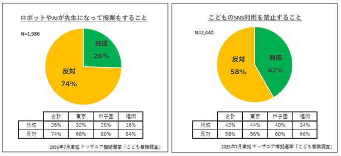 今回、政治や選挙が自分たちの生活に密接に関わっていることを知って欲しいという思いの下、こども達にとって身近な政策として、「ロボットやAIが先生になって授業をすること」「こどものSNS利用を禁止すること」について賛否を聞く“こども意識調査”を実施しました。