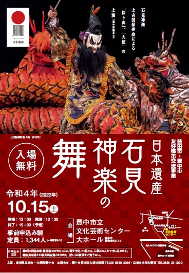 豊中市は、島根県益田市と共催で、益田市の伝統芸能「石見神楽」を令和4年(2022年)10月15日(土)に豊中市立文化芸術センターで開催します。