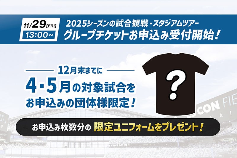 12月31日(火)までに対象試合へお申込みいただいたグループの皆様に、お申込み枚数分の2025年シーズン限定ユニフォームをプレゼント!