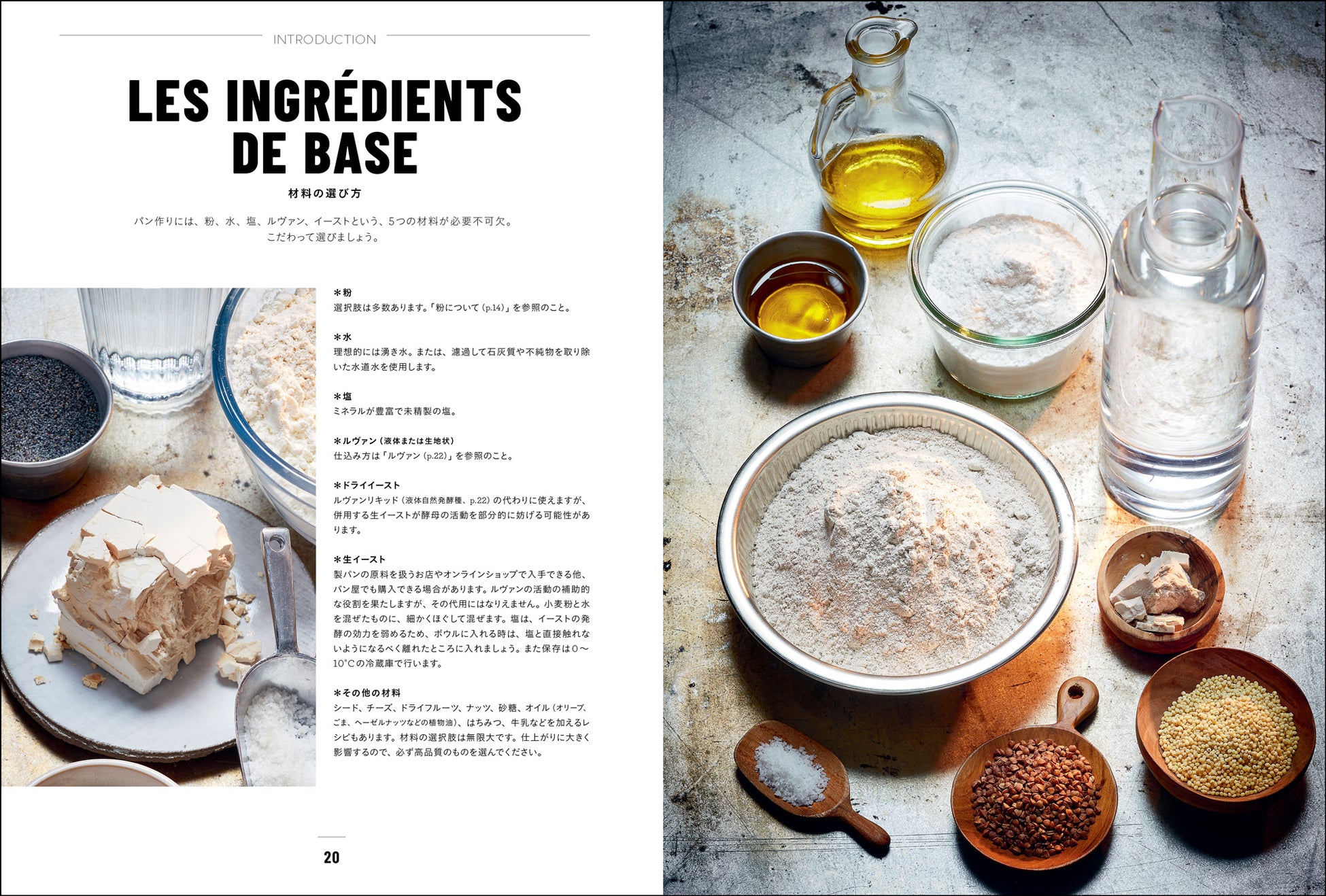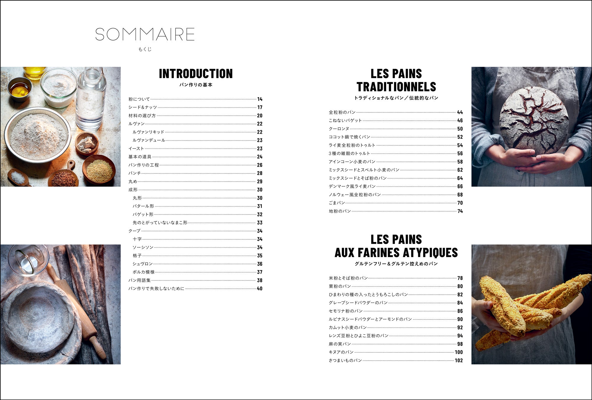 パン作りの基本や道具、用語の解説にはじまり、メゾンカイザーのパンの要である自然発酵種ルヴァンの作り方、そしてカイザーが理想とする本物のパンのレシピをグルテンフリーのパン、鍋で焼くグルテンフリーのパン、鍋で焼くパン、こねないバゲット、さまざまな粉を使ったパンに至るまで、豊富なラインナップでご紹介します。