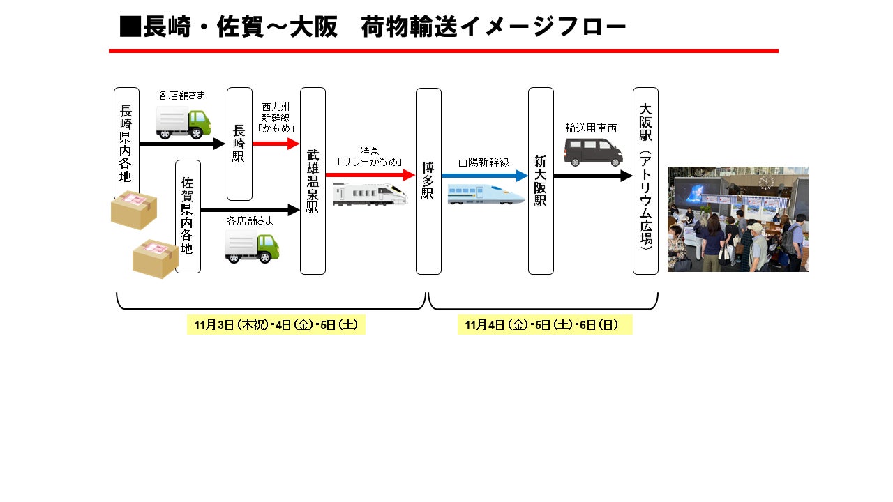 今回は、佐賀県・長崎県の作りたての商品や、日持ちの短い逸品を中心に、JR九州のスタッフがセレクトした商品を西九州新幹線「かもめ」、特急「リレーかもめ」、山陽新幹線で運び、イベント会場で販売します。